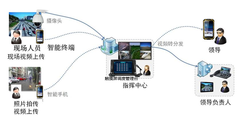 现场指挥系统作为远端指挥中心与现场人员的中间纽带,一方面将现场情况汇总与指挥中心进行反馈,一方面将上级指挥中心指令传达给现场人员。同时,可以将现场和种设备的音频、视频时时与指挥中心建立联系,确保指挥中心掌握现场一手资料。